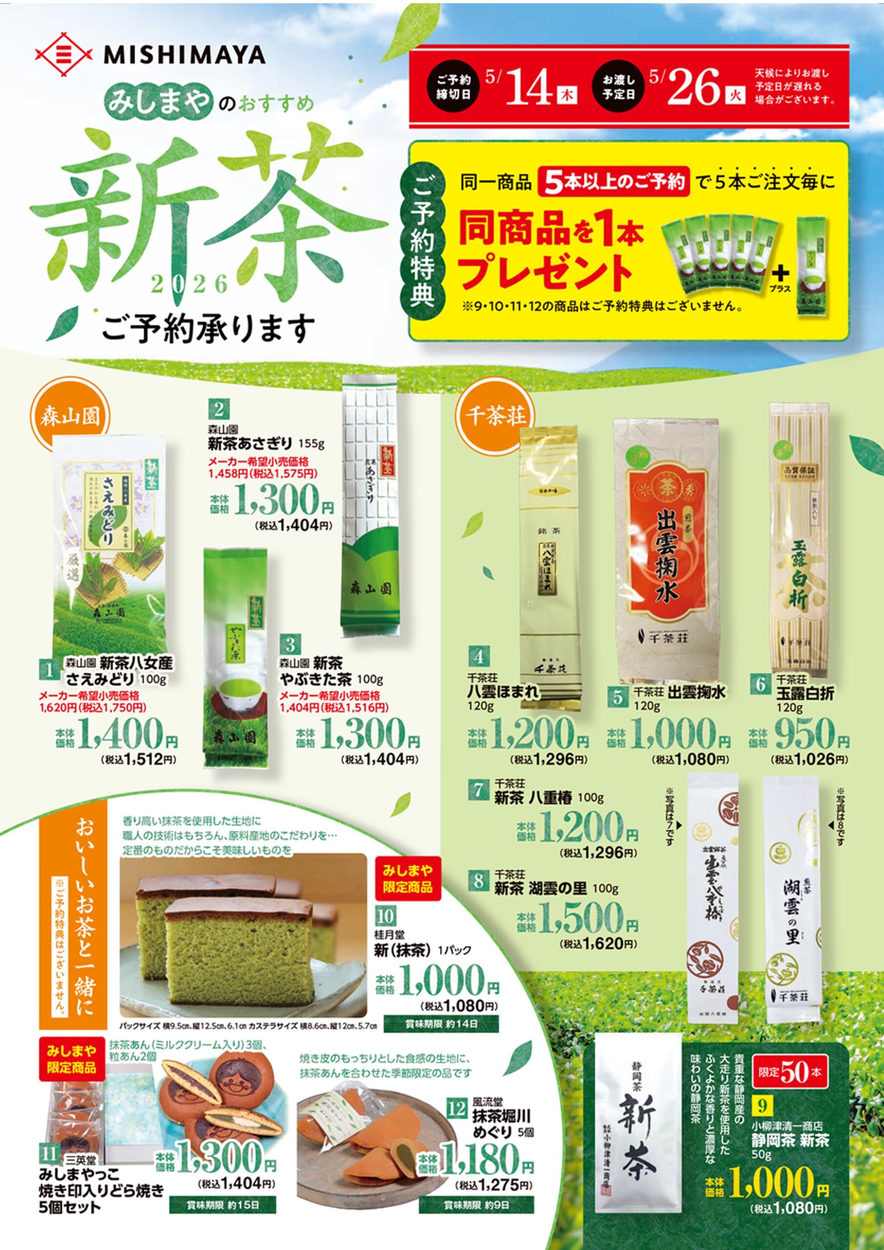 みしまや各店では、新茶、お菓子などのご予約を承り中です。