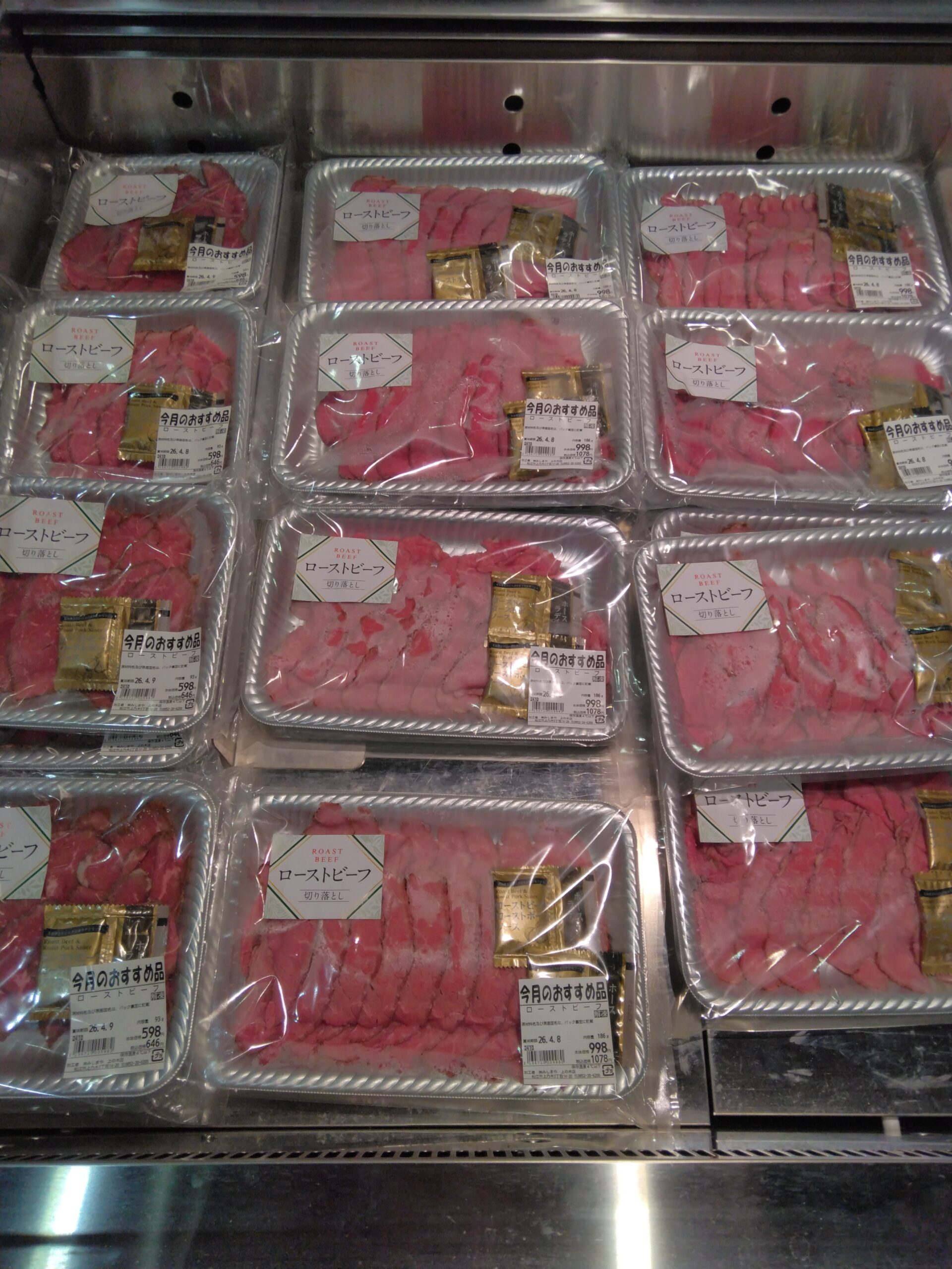 こんにちは! 上の木店です。 ローストビーフをおすすめしております。 サラダやサンドイッチ、丼などにお使いください。 おつまみにも良いですね! 本日もお客様のご来店お待ちしております。