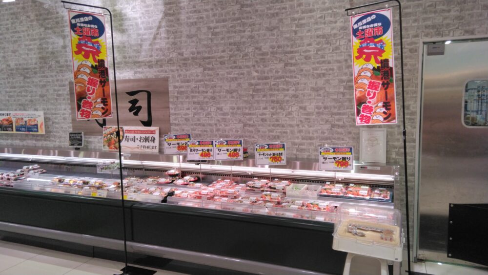 こんにちは!みしまや東川津店鮮魚コーナーです! 本日のおすすめは境港サーモン!生のうまみはいまだけですよ~!無解凍ならではの上品な脂ののりをぜひご賞味くださいませ!ぜひお買い求めください!