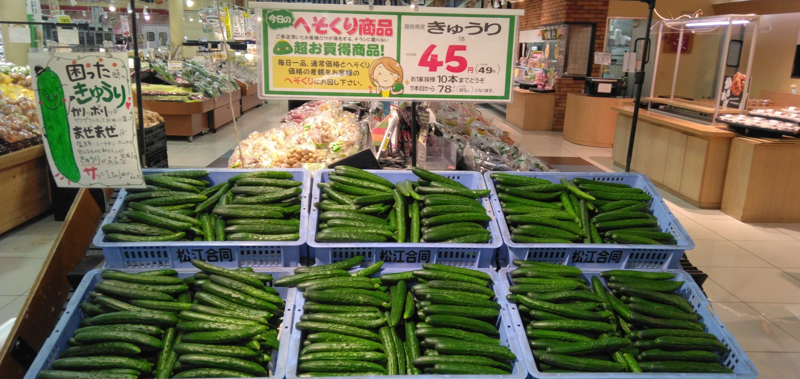 みしまや田和山店農産部門です。本日のおすすめはきゅうりです。そのままでもサラダや酢の物にしてもおいしいきゅうり!ぜひお買い求めくださいませ!