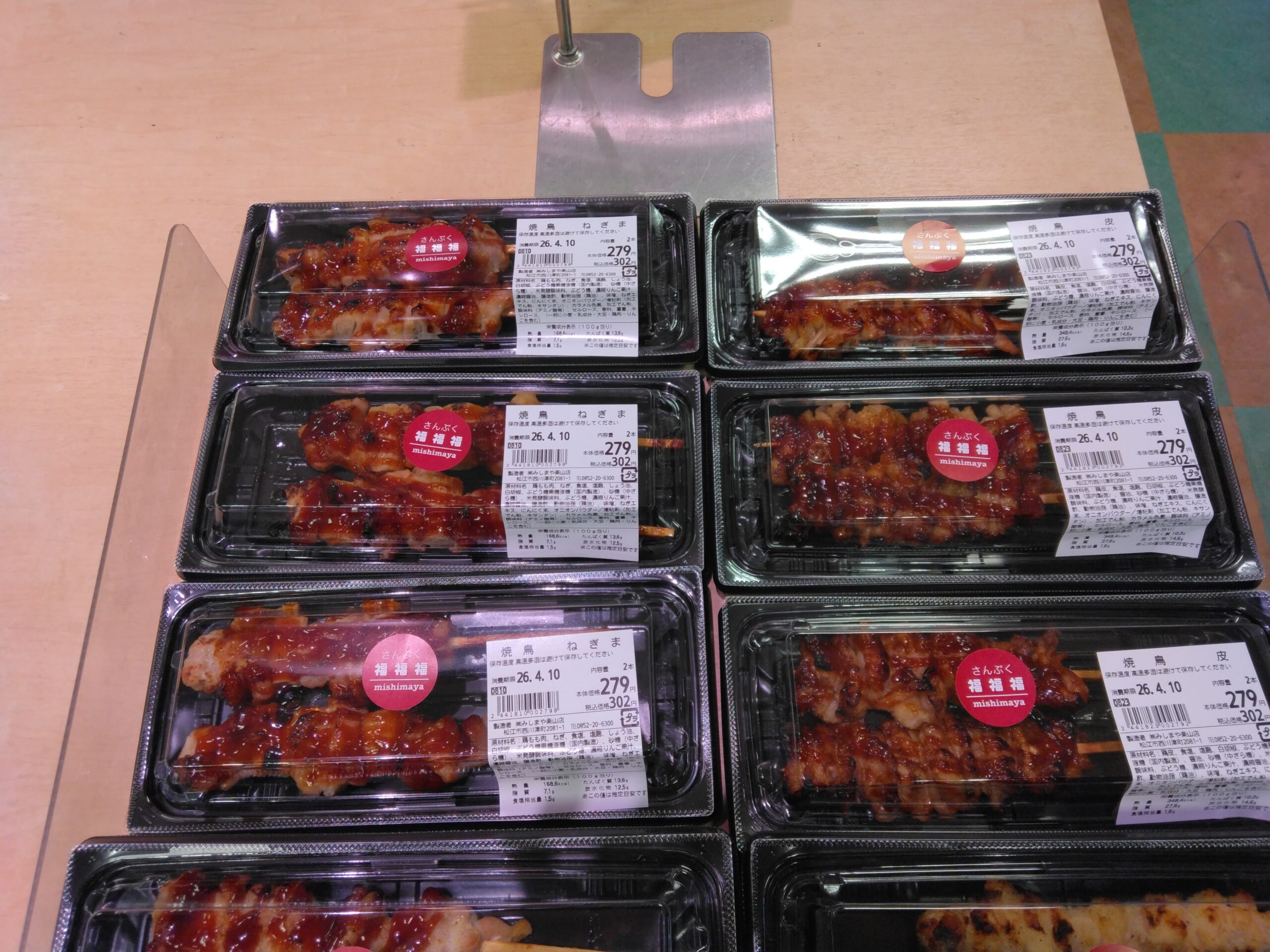 こんにちは。みしまや楽山店福福福です。 今日のオススメは焼鳥です。 ねぎま、皮、もも、ぼんじりと4種類の焼鳥を取り揃えております。 担当者オススメは皮です。 おつまみに最高です! 週末のお酒のお供にいかがですか。