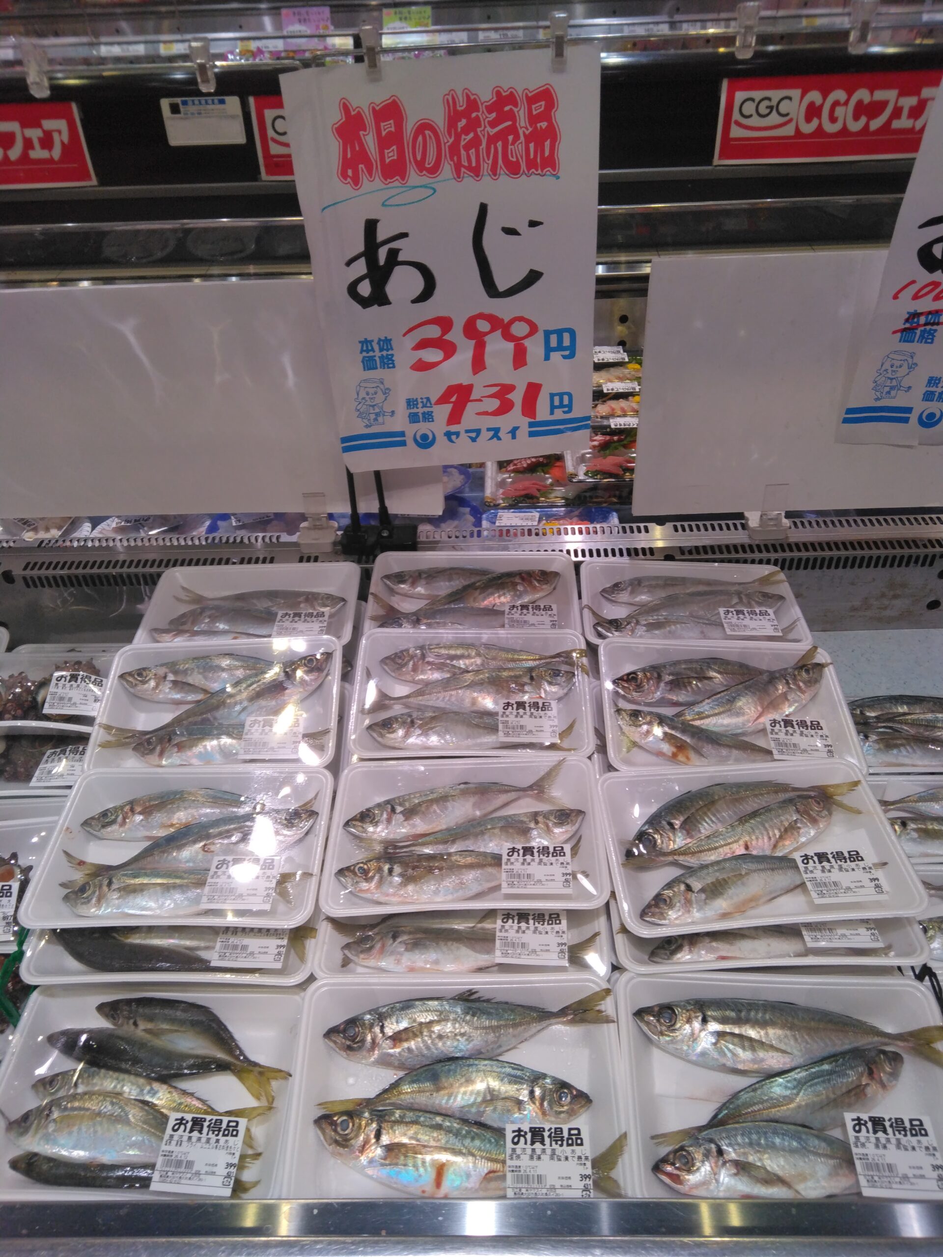 本日はアジがお買い得です。塩焼き、フライ、南蛮漬けなどにどうぞ。