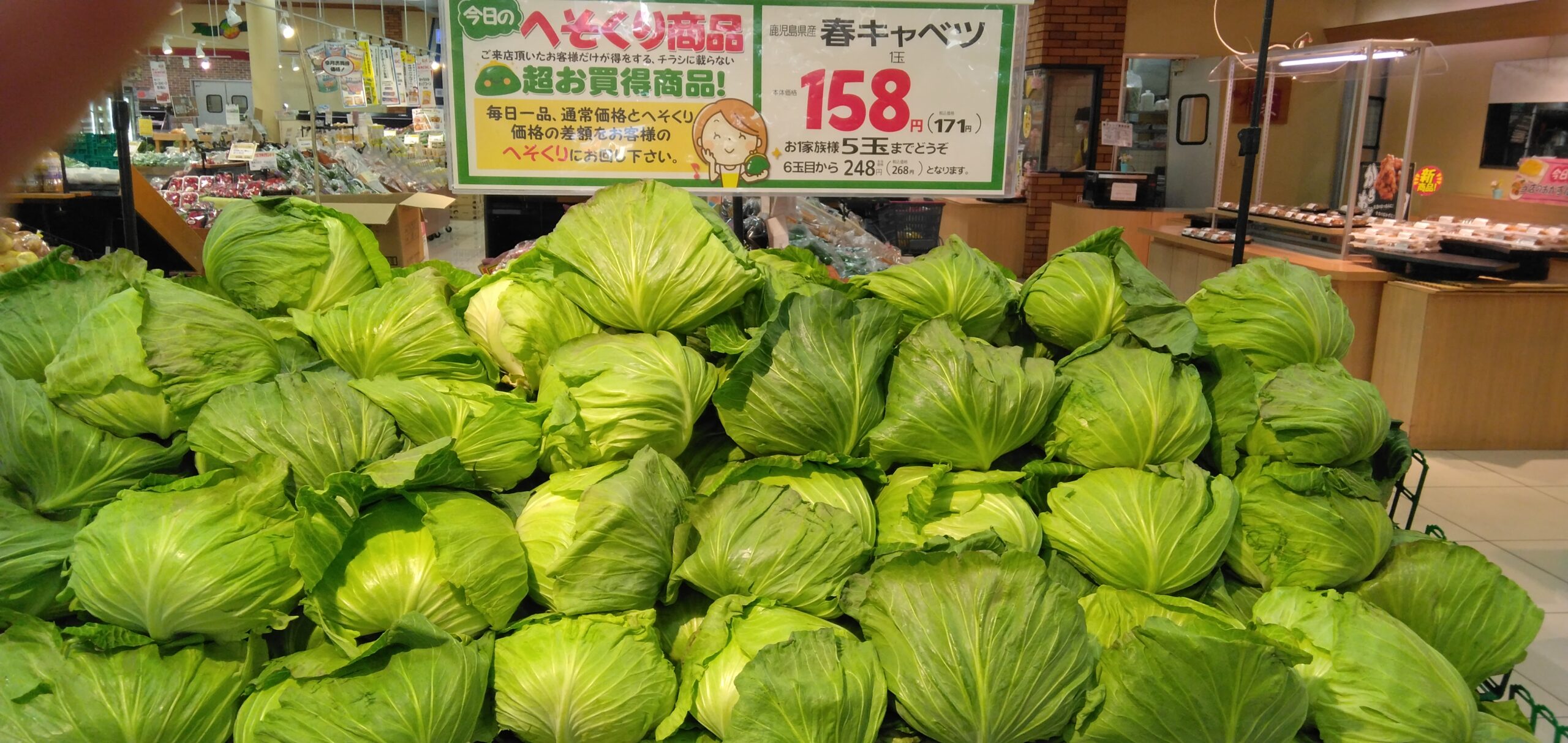 みしまや田和山店農産部門です。本日のおすすめは春キャベツです。そのままでも火を通してもおいしくいただけます!是非みしまや田和山店でお買い求めくださいませ!