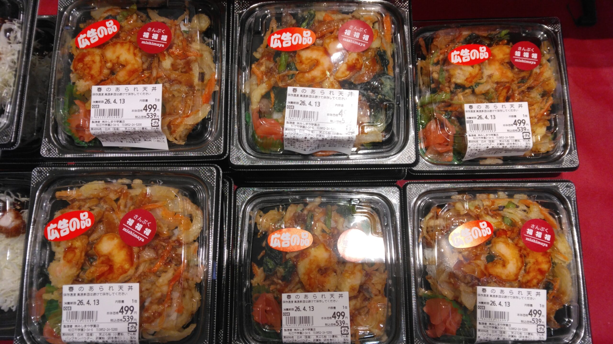 春、お花達も満開の季節ですね。 貴重な晴れた日を楽しみたいですね。 こちら、惣菜コーナーさんぷくも春真っ盛り! おすすめの、あられ天丼に、菜の花を入れた春のあられ天丼。 今日、広告の品最終日となりました。 ランチに、いかがでしょうか。 ご来店お待ちしております。