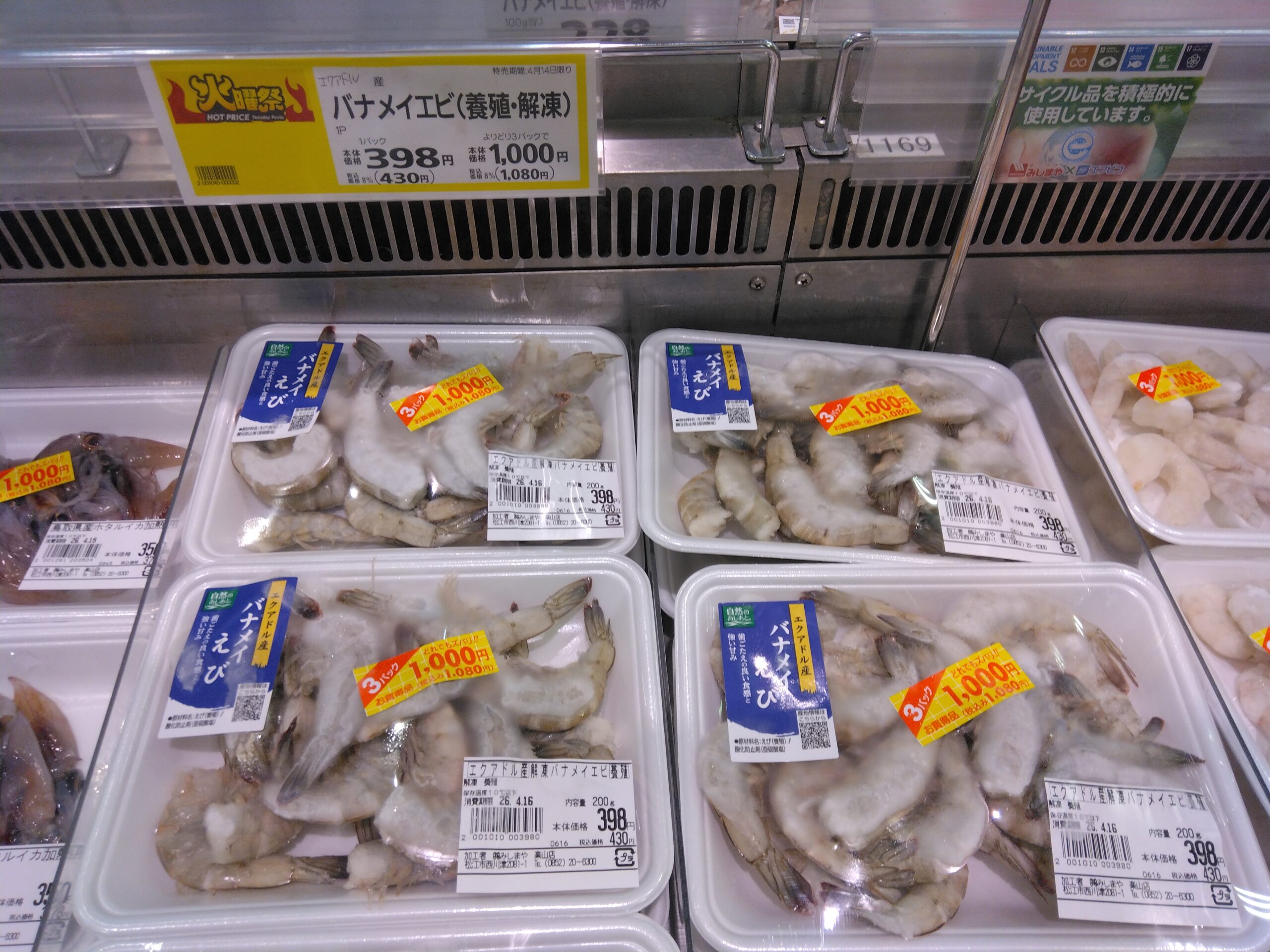 おはようございます!みしまや楽山店鮮魚です。本日のおすすめは、エクアドル産バナメイエビです。1パック200g398円(税込430円)で販売しております。本日は火曜祭!3パック1000円(税込1080円)の対象商品でもあります。ぜひお買い求め下さいませ!