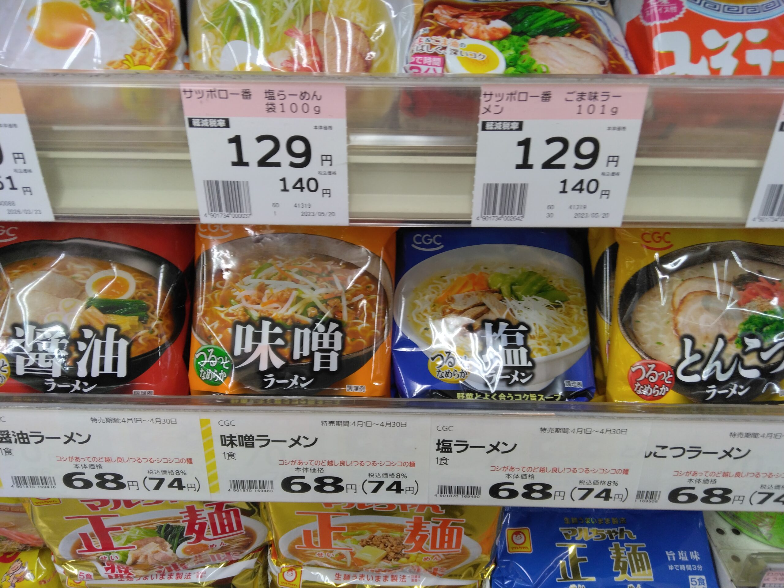いつもご来店ありがとうございます!みしまや鹿島店です。本日は『CGC袋麺のばら売り』をご紹介します。種類は醤油、味噌、塩、とんこつがあり、それぞれ5食パックもありますが、どの味にするか迷ったときはばら売りでいろいろ試してみてはいかがでしょうか。お値段もお手ごろ、お求めやすくなっております!どれも美味しいですよ(^^)ぜひお試しください。
