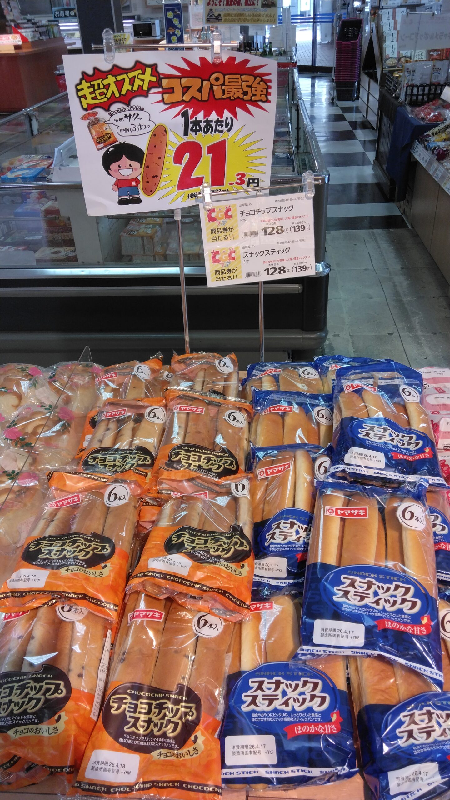 おはようございます。みしまや中央店です。今日のおすすめは、ヤマザキのスティックパンです。CGCフェアの対象商品ですので、小腹が空いた時用にいかがでしょうか!