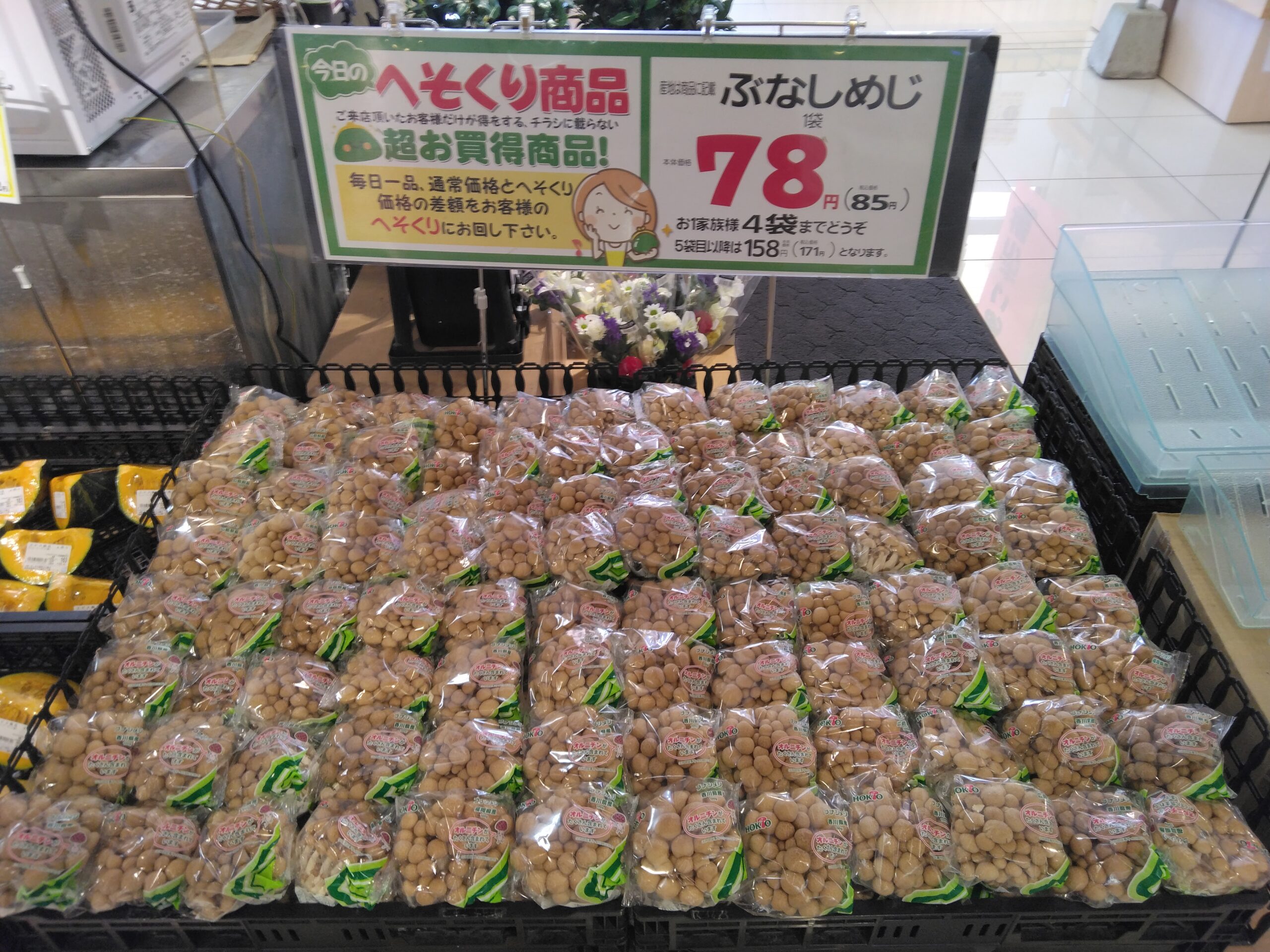 こんにちはみしまや雲南三刀屋店です。 本日のへそくりはぶなしめじです。 炒め物や鍋物にも使えて万能ですよね~。 ぜひお買い求め下さいませ!
