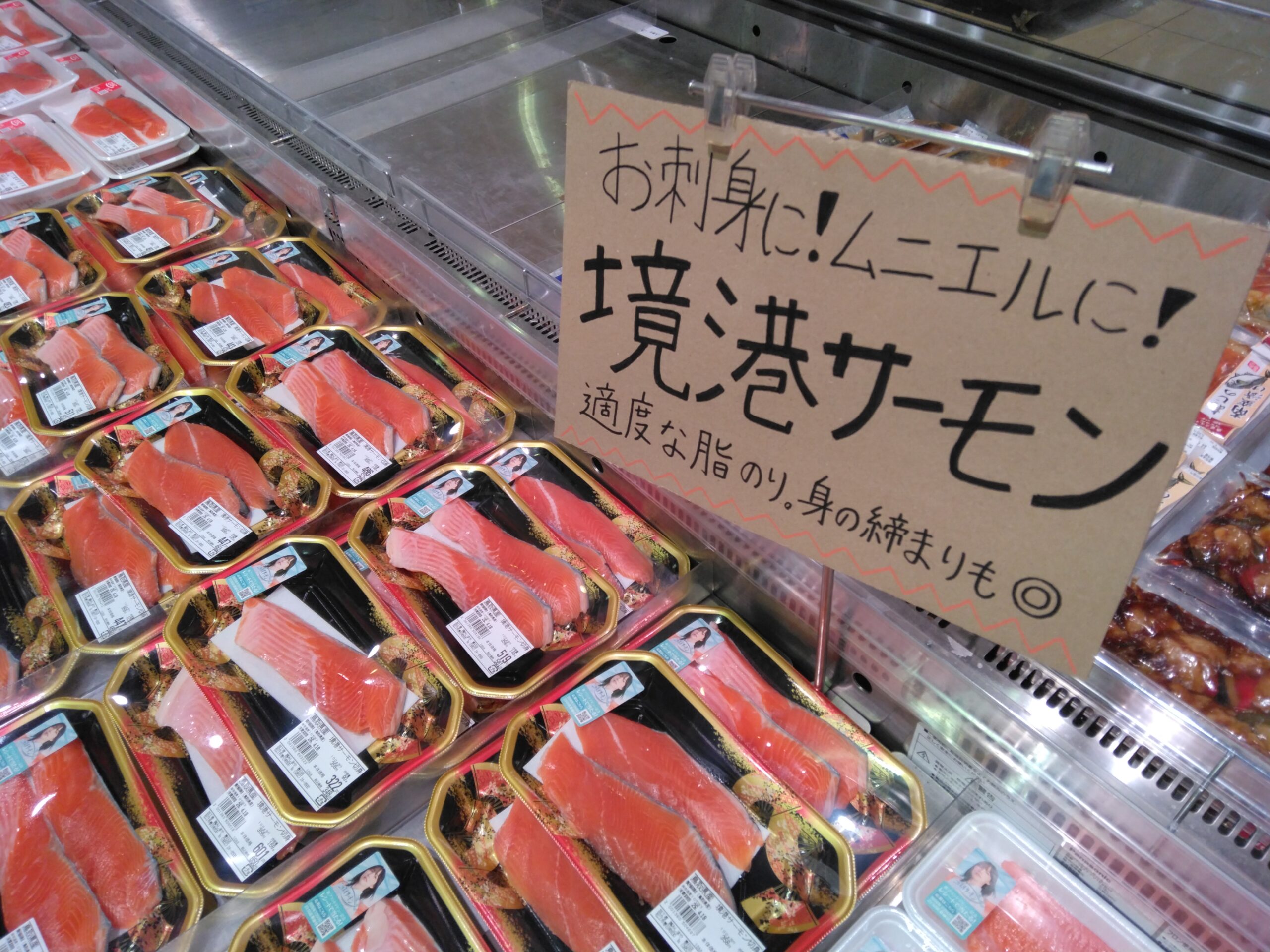 本日のおすすめは境港サーモンです。 切り身はムニエルに!お刺身用はカルパッチョでもいいですね!推しております。おすすめしております。ぜひどうぞ!