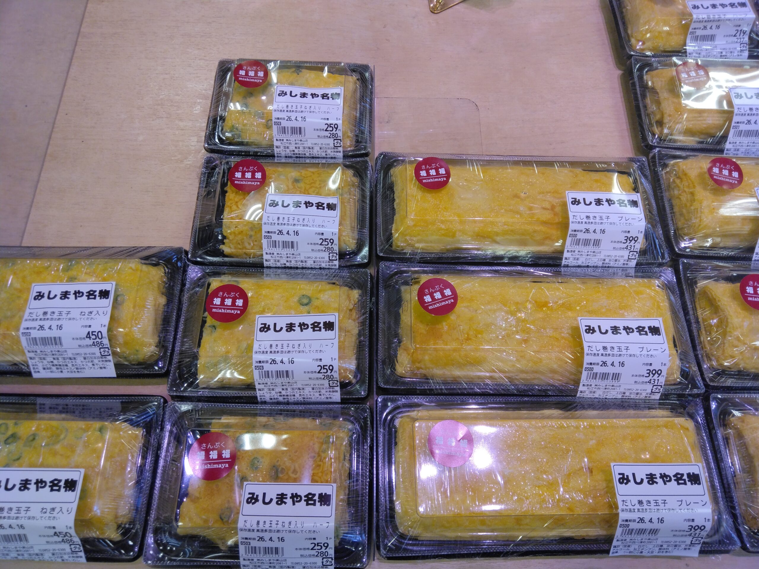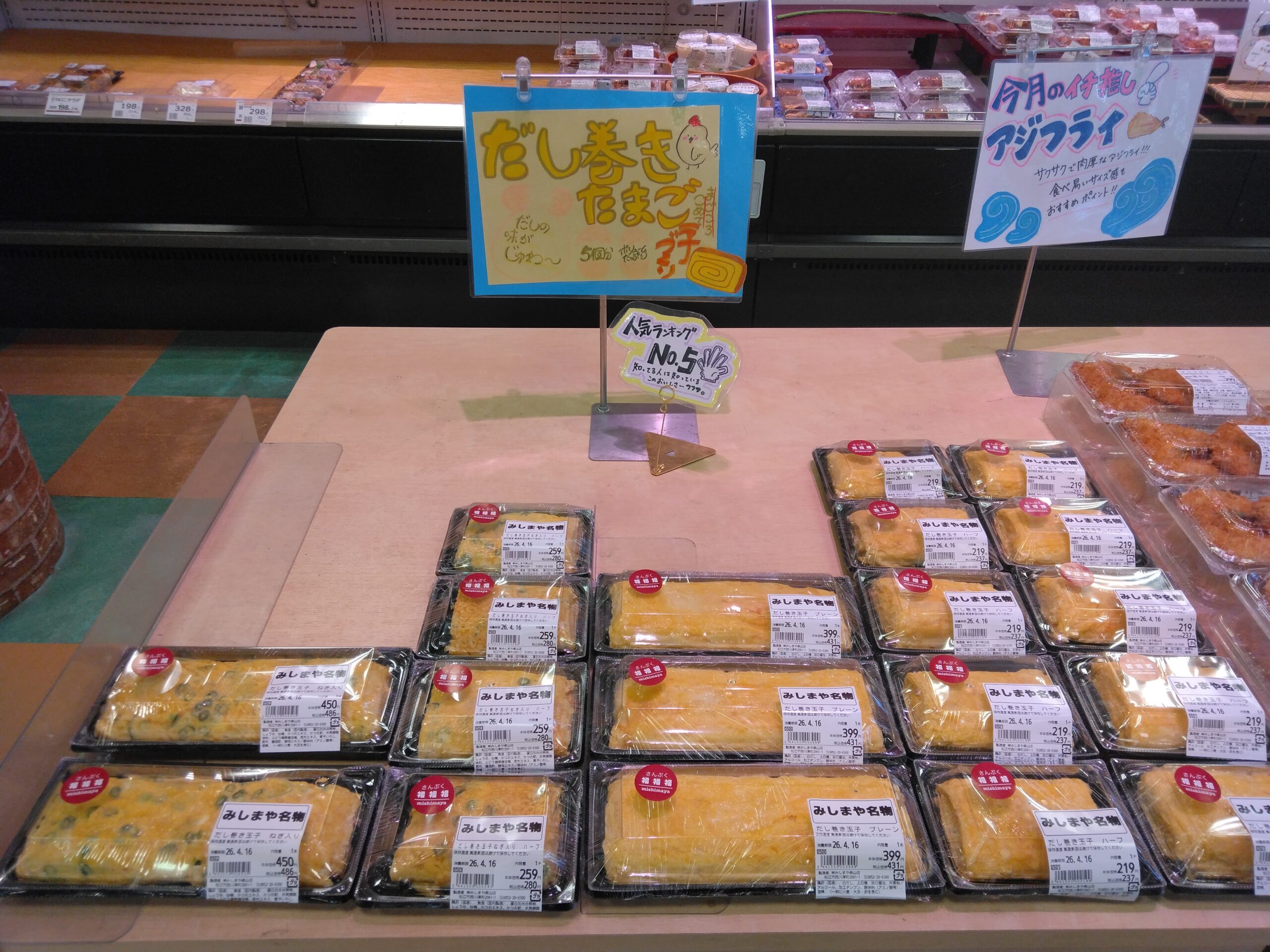 こんちには。 みしまや楽山店福福福です。 今日のオススメはだし巻き玉子! さんぷくで人気のだし巻き玉子はいかがですか。 出汁の利いた優しいお味に仕上がっています。 まだ食べたことのない方も是非食べてみてください。