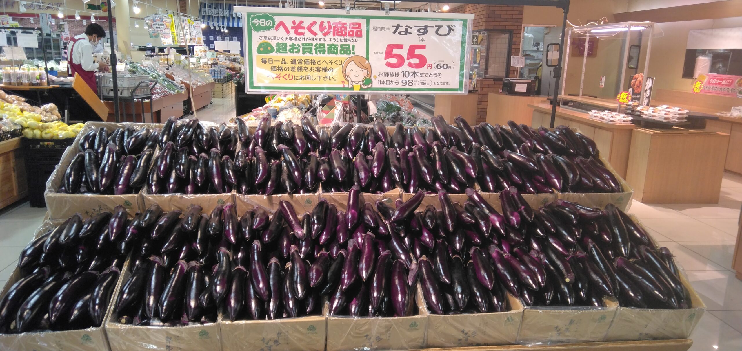 みしまや田和山店農産部門です。本日のおすすめはなすび1本です。火を通すとトロトロでおいしいなすび!本日のご飯の一品にいかがでしょうか。是非みしまや田和山店でお買い求めくださいませ!