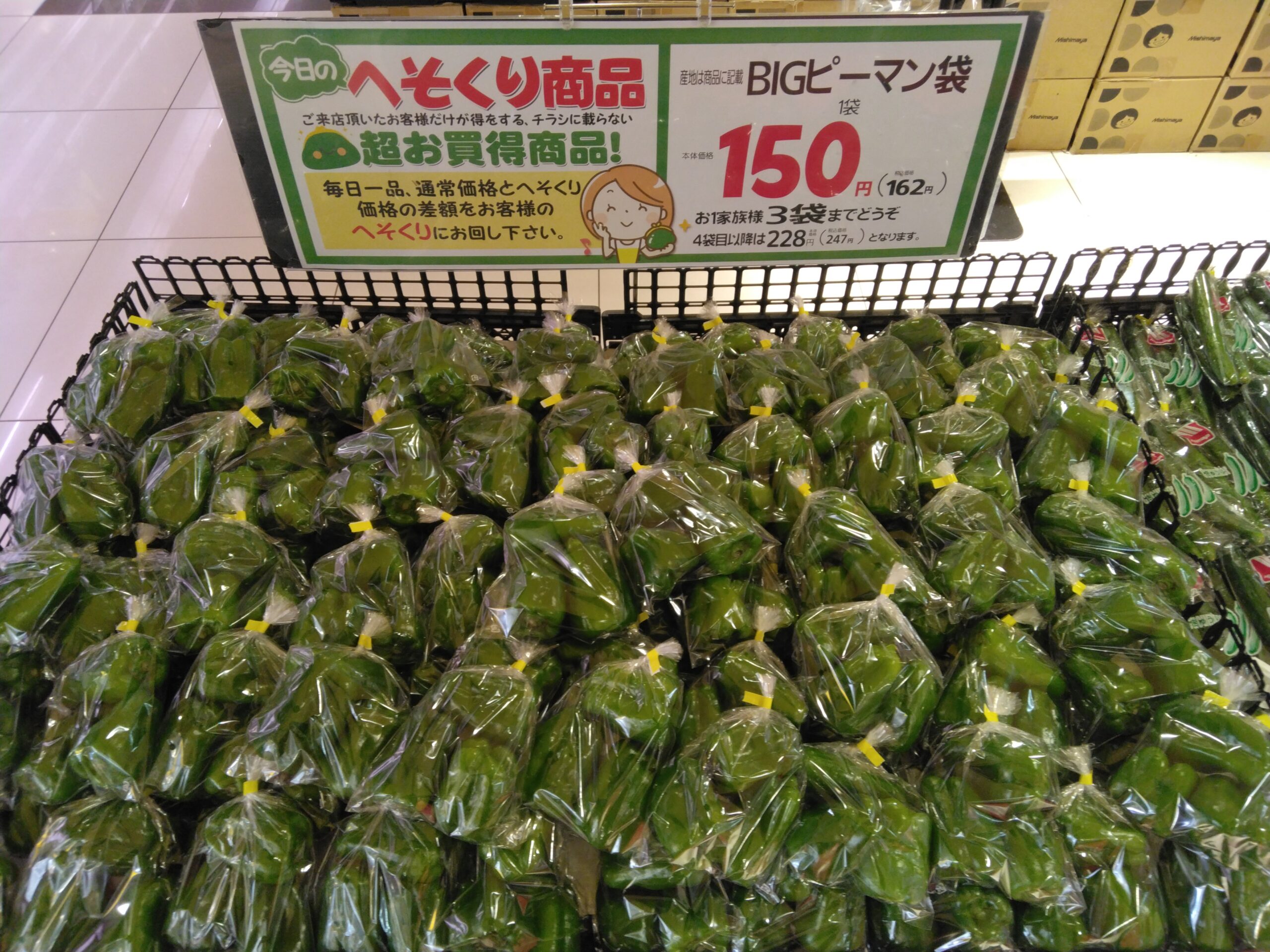 こんにちはみしまや雲南三刀屋店です。 本日のへそくりはBIGピーマンです。 今日の主役!肉厚ジューシーな「BIGピーマン」この圧倒的な存在感!見つけたら即買い必至ですね!普通のピーマンより一回りも二回りも大きく、とにかく肉厚! このサイズ感を活かして、肉詰めピーマンはいかがでしょうか!ひき肉をたっぷり詰めるのが一番の贅沢! 食卓がパッと華やかになること間違いなしのBIGピーマン。ぜひお買い求め下さいませ!
