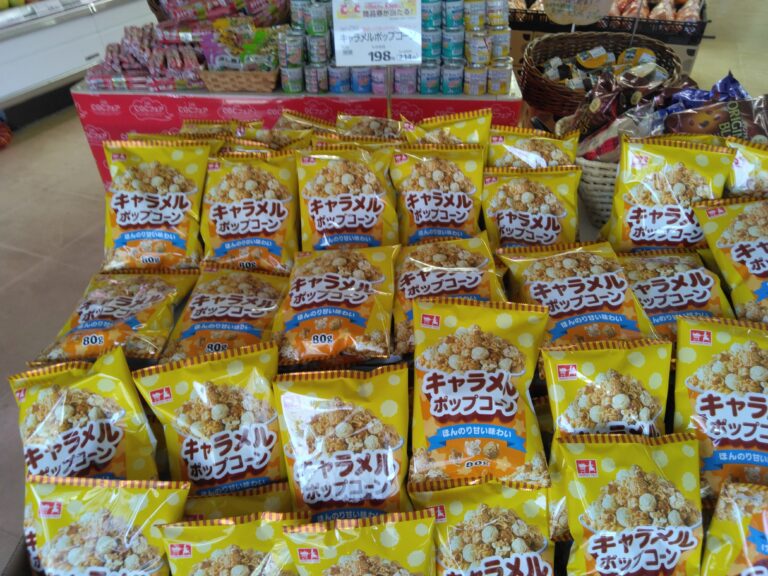 こんにちは八束店です。今日のおすすめはキャラメルポップコーンです。パリパリ食感で食べるととまらくなります!甘いポップコーンです。是非どうぞ。