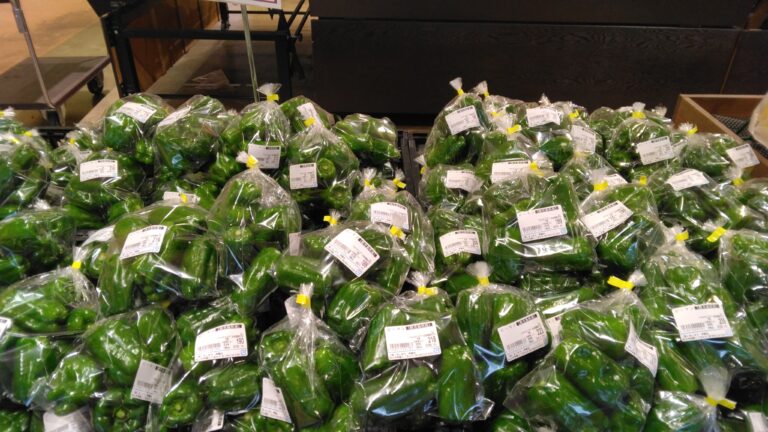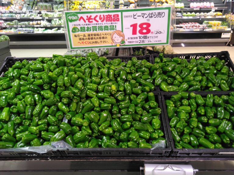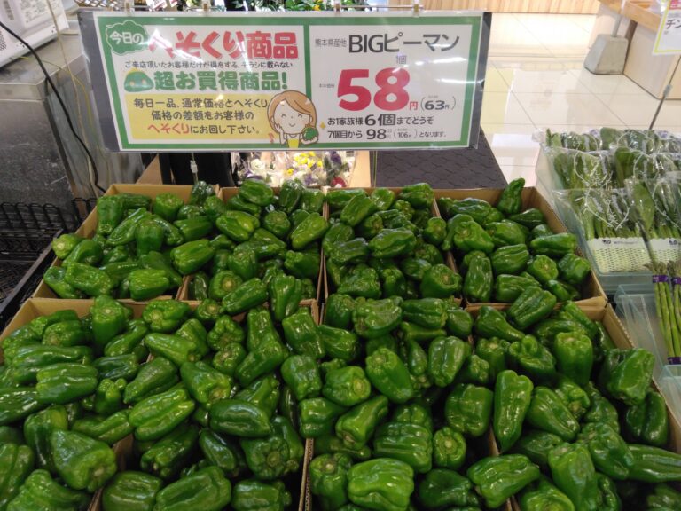 こんにちはみしまや学園店お野菜コーナーです。昨日からの雨で少し寒かったり、蒸し暑かったりで体調崩しやすい時期かもしれません。 しっかりとお野菜を使ったメニューで免疫を上げていきましょう。 本日はピーマンがお買い得になっております、グラム売りなので用途人数に合わせてお買い求めくださいませ、炒め物、和え物などにいかがでしょうか。