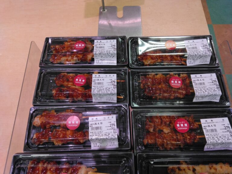 こんにちは。みしまや楽山店福福福です。 今日のオススメは焼鳥です。 ねぎま、皮、もも、ぼんじりと4種類の焼鳥を取り揃えております。 担当者オススメは皮です。 おつまみに最高です! 週末のお酒のお供にいかがですか。