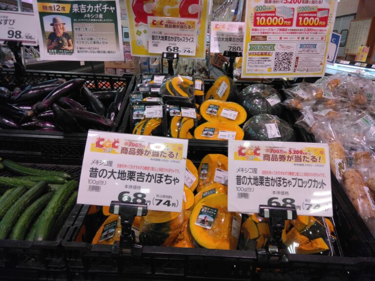 こんにちは。楽山店です。ただ今みしまやCGCフェア開催中です。本日おすすめはメキシコ産栗吉カボチャ、糖度12度と甘さのあるカボチャです。煮物に、天ぷらに、サラダにいかがでしょうか。また合わせて本日号外チラシも開催中です。ぜひのご来店お待ちしております。