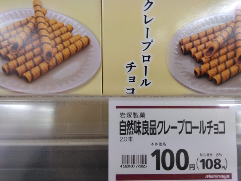 みしまや鹿島店です。本日のおすすめ商品は、クレープロールチョコです。チョコクリームをサクサクの薄焼きクレープ生地で包んだ焼菓子です。お茶うけにいかがでしょうか。
