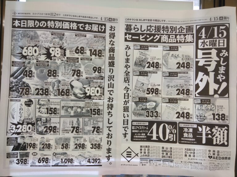 本日4月15日は全店号外です。当店水産コーナーでは銀鮭切身が号外特価となっております。どうぞこの機会にお立ち寄りお買い求めくださいませ。