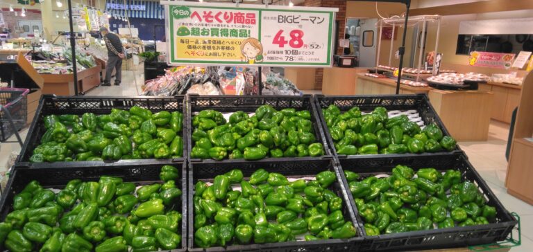 みしまや田和山店農産部門です。本日のおすすめはピーマンです。炒め物に彩りをプラスするのにピッタリです!是非みしまや田和山店でお買い求めくださいませ!