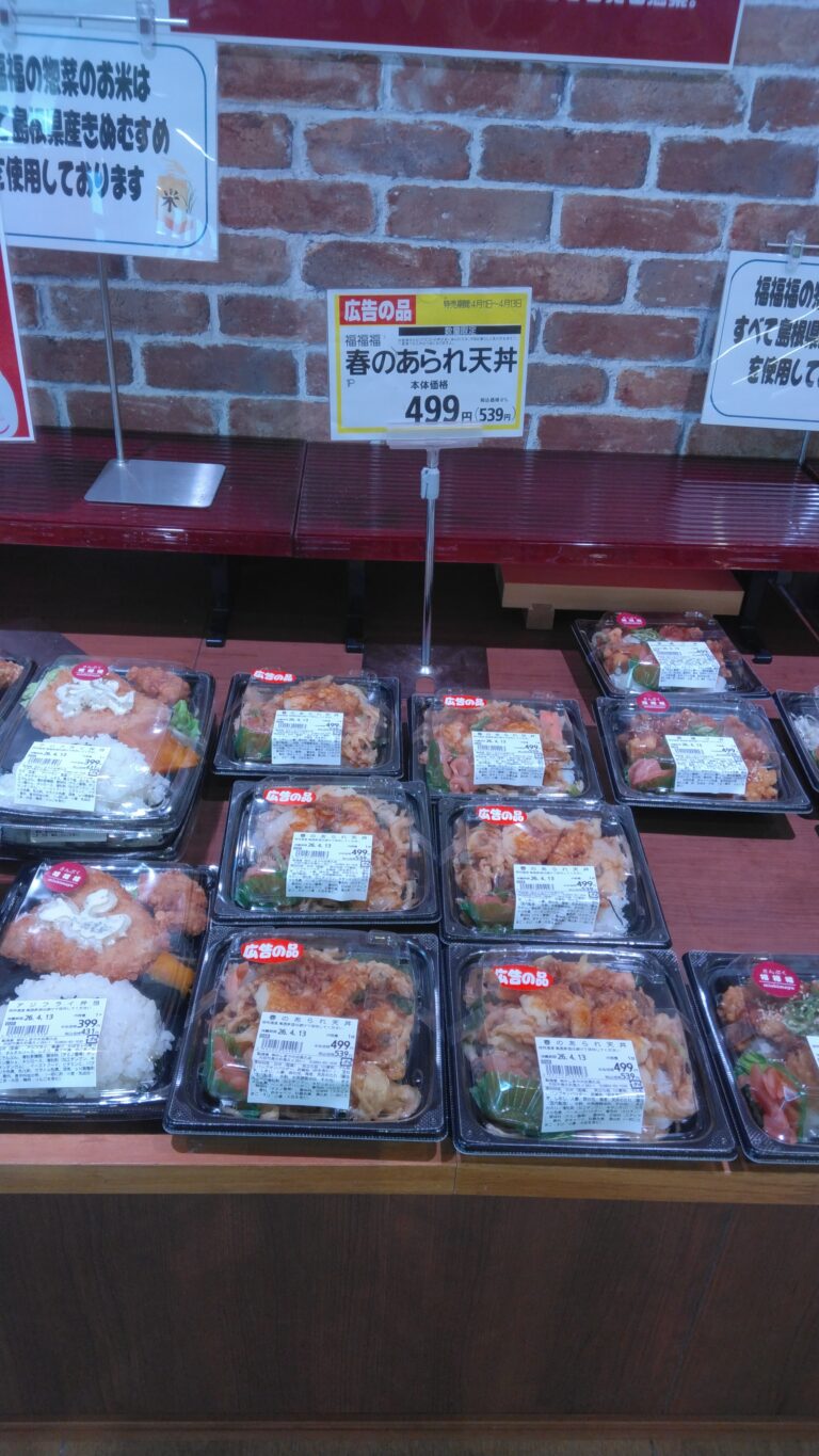 こんにちは、大田長久店 福福福です。 本日限り春のあられ天丼が499円で大変お買い得となっております。春らしい菜の花入りです。 是非お買い求めくださいませ。