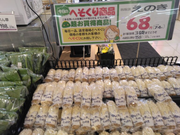 こんにちはみしまや雲南三刀屋店です。本日のへそくりはえのき茸です。本体価格68円税込み価格74円です。是非ご来店お待ちしております。
