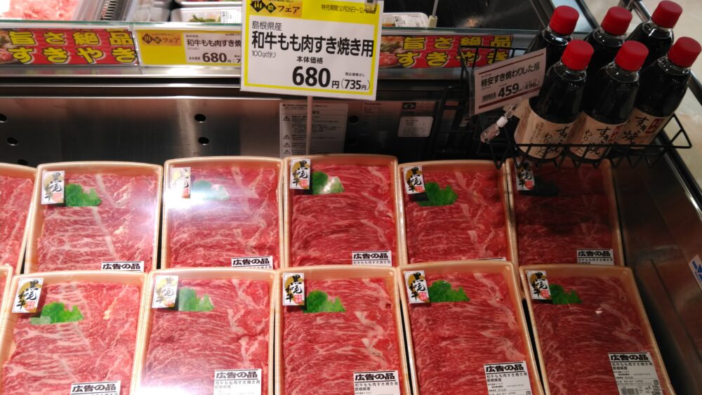 こんにちはみしまや上の木店です。 本日のおすすは和牛ももすき焼き用です。 柿安さんのすき焼きわりしたと相性ピッタリ!! ぜひお買い求めくださいませ!