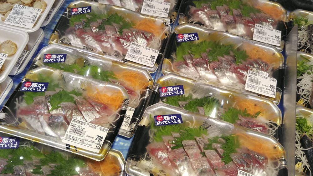 みしまや楽山店鮮魚です。本日のおすすめはマアジ刺身!マアジがだんだん脂がのってきています!これからまだまだのってくるとは思いますので、ぜひお刺身でご賞味くださいませ。ぜひお買い求めください。ご来店お待ちしております。