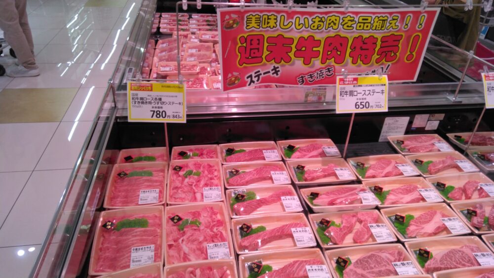 おはようございます!本日のみしまや東川津店精肉コーナーからのおすすめ商品は、国産和牛肩ロース各種が780円(税込価格843円)と、お買い得となっております!ステーキのみ昨日に引き続き650円(税込価格702円)と、こちらもお買い得となっておりますので是非お買い求めください!その他にもお買い得商品ございますので是非本日もみしまや東川津店へのお越しをお待ちしております♪