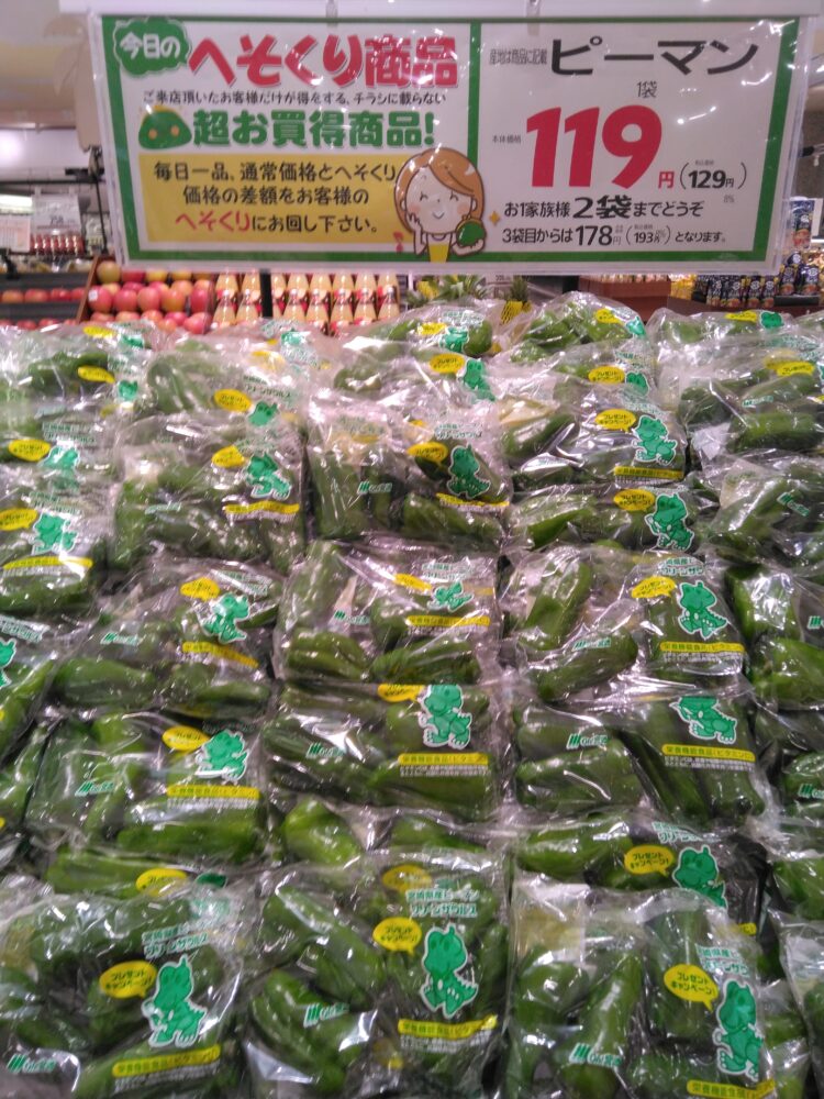こんにちは!みしまや東川津店です。 本日のへそくり商品はピーマン! この機会にぜひともお買い求めくださいませ(^^)
