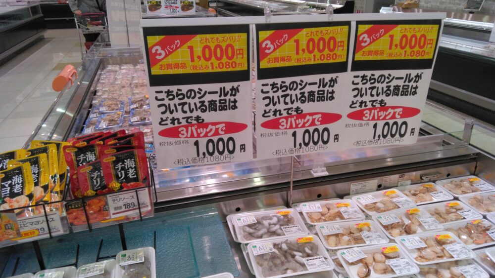 おはようございます!みしまや東川津店水産部門です。本日は火曜祭!水産部門では、3パック1000円セールを行っております。魚、刺身、寿司、明太子、干しカレイなど、どの組み合わせでも3パック1000円です。対象商品は、黄色いシールが目印です。ぜひお買い求めくださいませ!