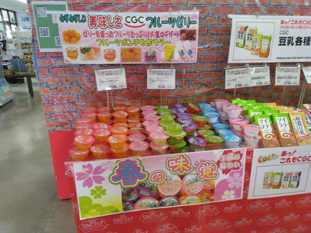 春ですね、フルーツゼリー今月のCGCフェアです、冷たく冷やしたり、フルーツポンチにしたり、おやつとしても大活躍です。