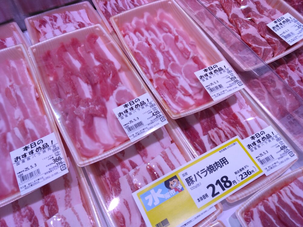 春日店です。本日のおすすめは国産豚バラ肉焼肉用です。ゴールデンウィークバーベキューにいかがでしょうか。豚丼にもおすすめです。本日100g218円とお買得になっております。是非お買い求めくださいませ!