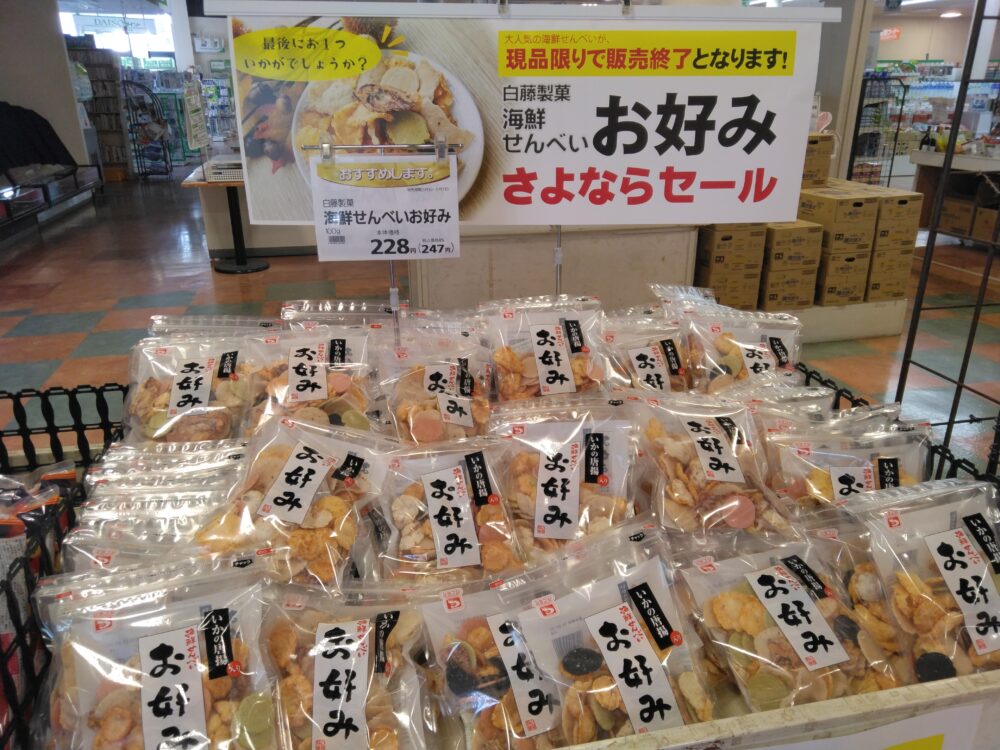 こんにちは、楽山店です。 本日おすすめするのは白藤製菓の海鮮せんべい。色々な種類が入っていて、ついつい手がのびちゃいます♪ 実は海鮮せんべいは、今ある在庫で終了となってしまいます! お茶請けにピッタリの商品ですので、今あるうちに是非お買い求め下さいませ。
