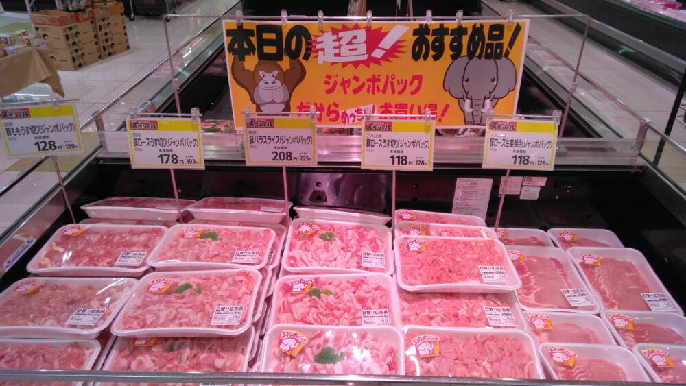 本日の東川津店精肉コーナーからのおすすめは、豚ジャンボパック各種です。 豚ジャンボがいつもよりg20円お買い得となっております。 買いだめにいかがでしょうか?是非お買い求めくださいませ!