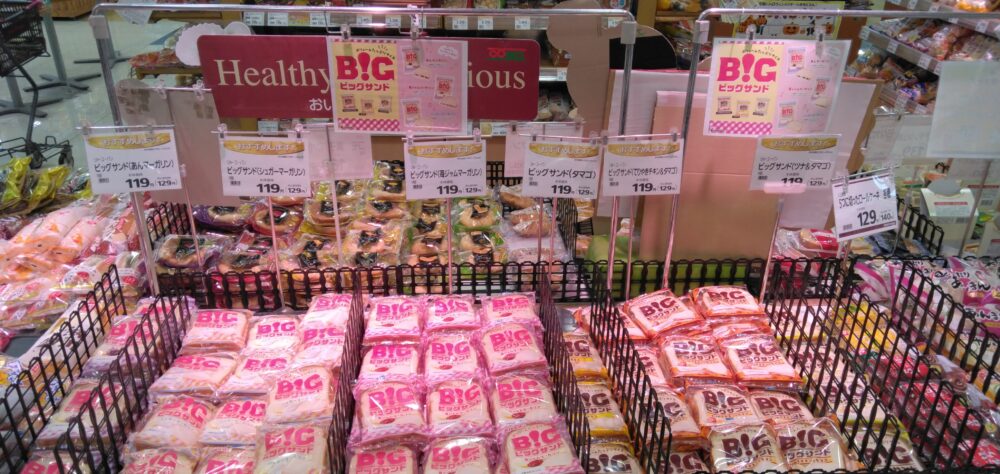 みしまや田和山店日配コーナーのおすすめ商品は、ビッグサンド各種でございます!大きめサンドでボリューム満点!シュガーマーガリンやあんマーガリンなど新フレーバーも登場!ぜひお買い求めくださいませ!