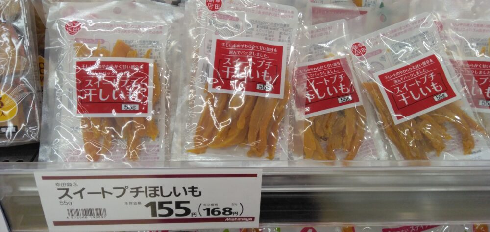みしまや田和山店のお菓子コーナーおすすめ商品は、幸田商店のスイートプチ干しいもです♪柔らかくて甘い部分を選んでパックした厳選された干しいもになっております。食べきりタイプなのも嬉しいですね♪ぜひ今日のおやつにいかがでしょうか♪