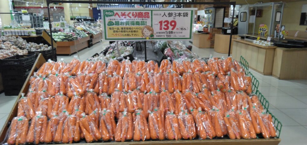 こんにちは、みしまや田和山店農産部門です。本日のおすすめは【人参3本】です。ぜひお買い求めくださいませ。ご来店お待ちしております。