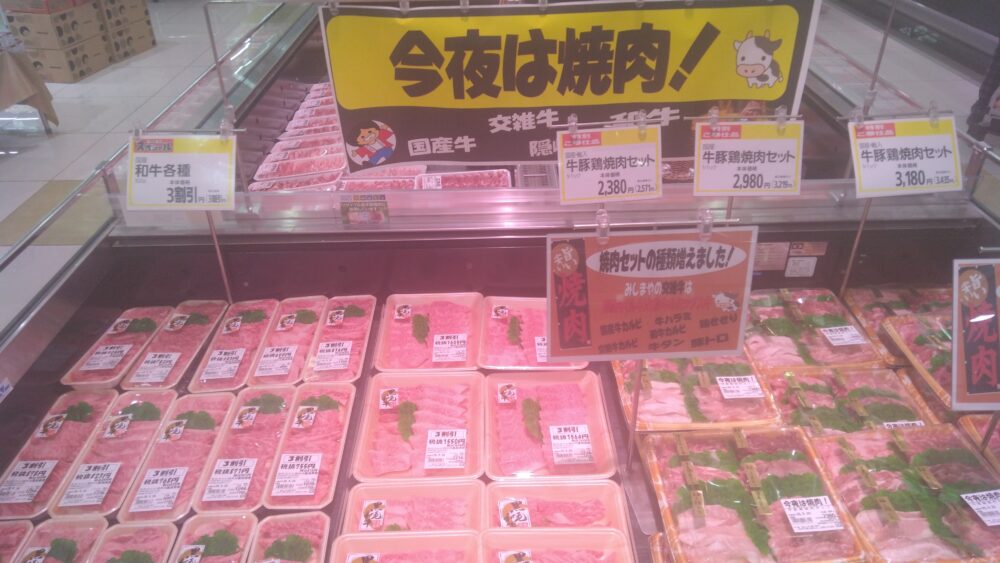 本日の東川津店精肉コーナーからのおすすめは、焼肉各種です。 和牛カルビ3割引、焼肉セット各種を取り揃えております。和牛カルビは現品限りとなつております。 是非お買い求めくださいませ!