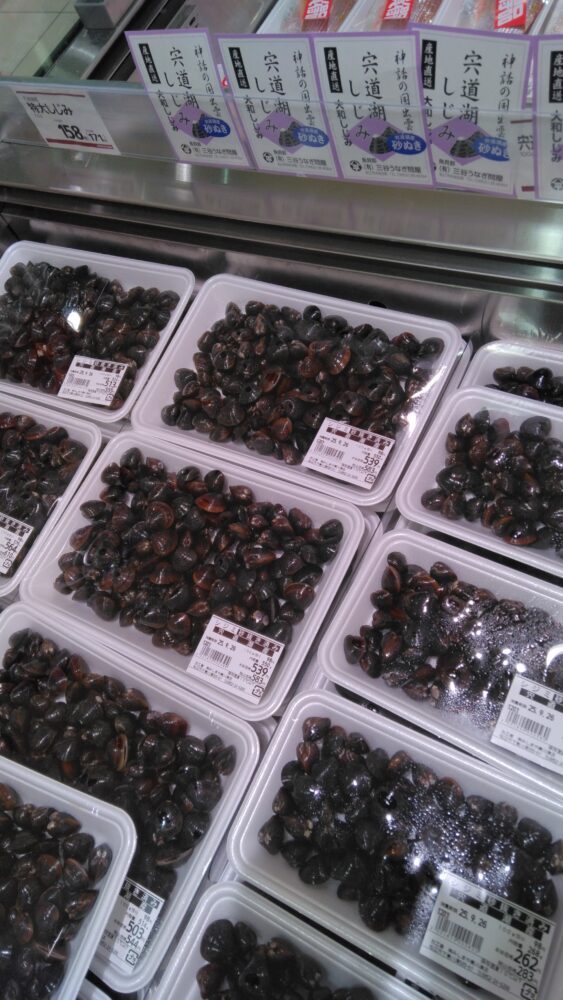 こんにちは!みしまや東川津鮮魚コーナーです! 本日も当店におきましては、松江のうまみであるしじみを販売中!味噌汁は故郷を感じる優しい味わいです!ぜひお買い求めくださいませ!