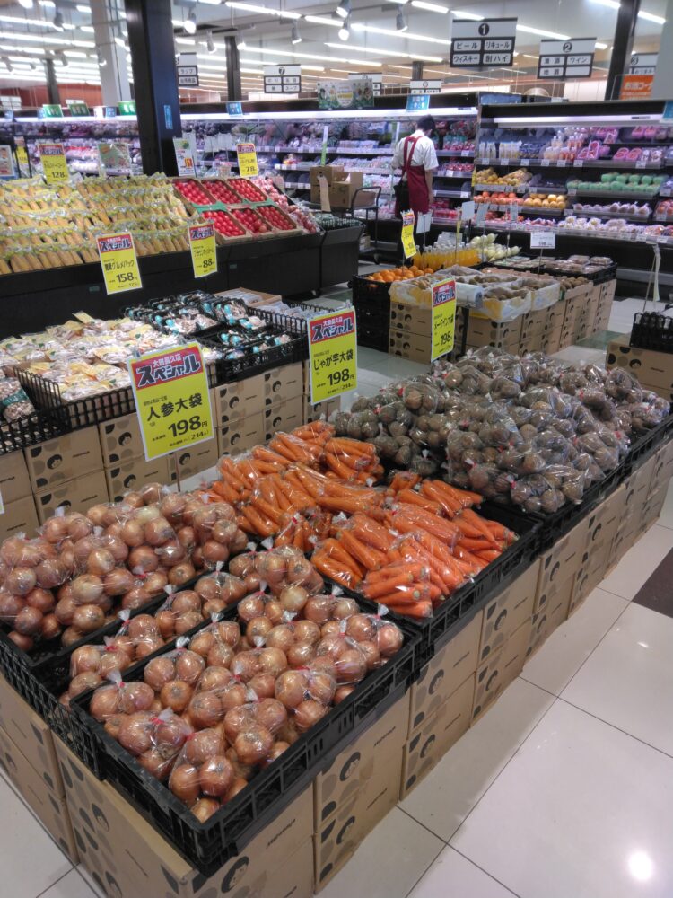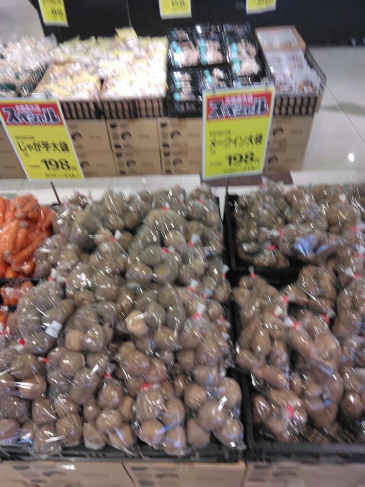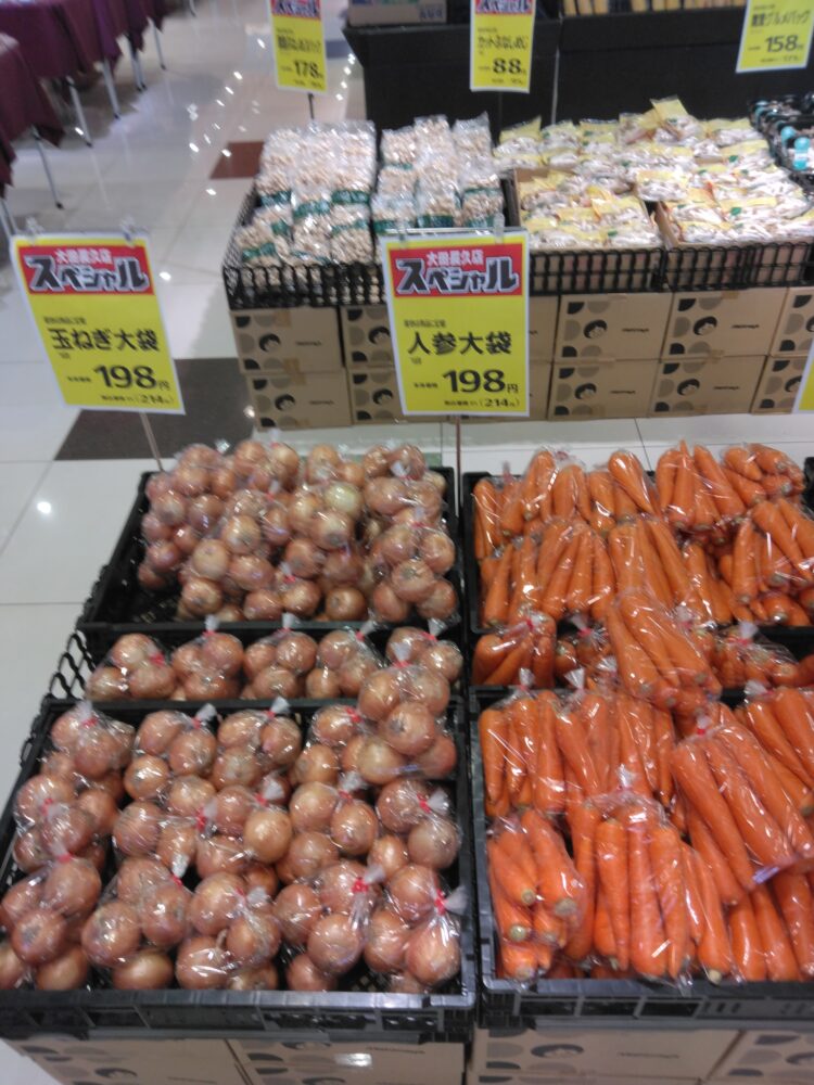 本日は人参、じゃが芋、玉ねぎ、メークインの大袋入りがお買い得です。カレーやシチュー、炒め物などにご活用下さい。