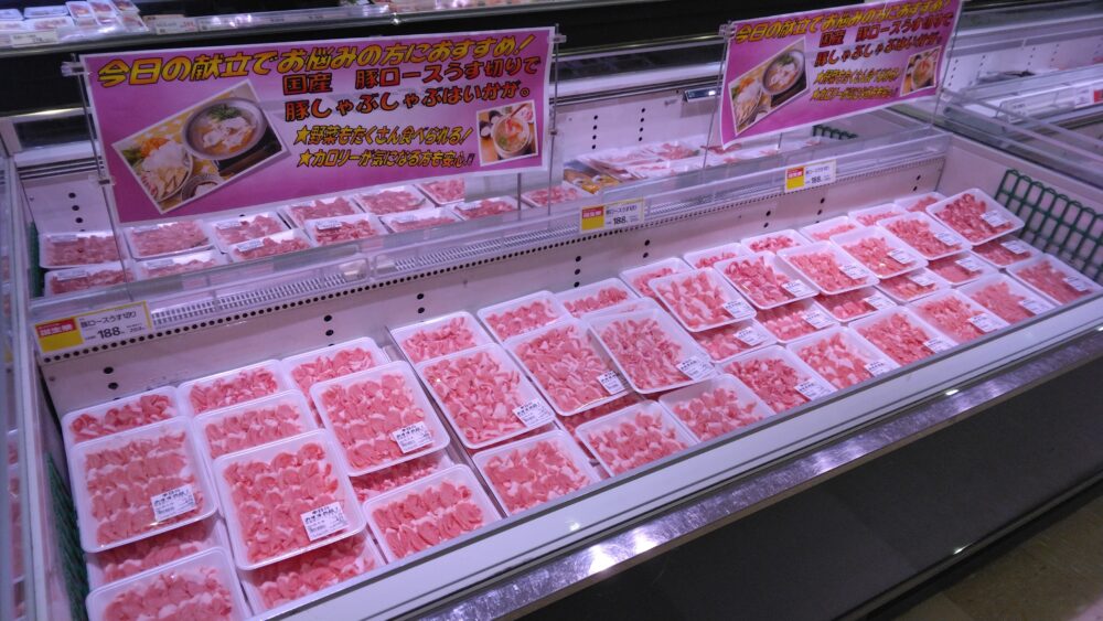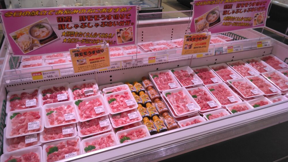 こんにちは、みしまや学園店です。昨日、今日、28周年の誕生祭を開催しております。各コーナーお買い得商品を準備をしております。是非お越し下さい。 精肉コーナーからのおすすめ商品は、国産若鶏むね肉100g当たり本体価格68円(税込み価格74円)国産豚ももうすぎり100g当たり本体価格148円(税込み価格160円)国産豚ロースうすぎり100g当たり本体価格188円(税込み価格203円)国産牛こまぎれ100g当たり本体価格298円(税込み価格322円)となっております。是非精肉コーナーにお立ち寄り下さい。ご来店お待ちしております。