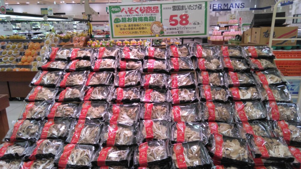 東川津店本日のへそくり商品は舞茸です。炊き込みご飯や牛肉と一緒にしぐれ煮などいかがでしょうか?