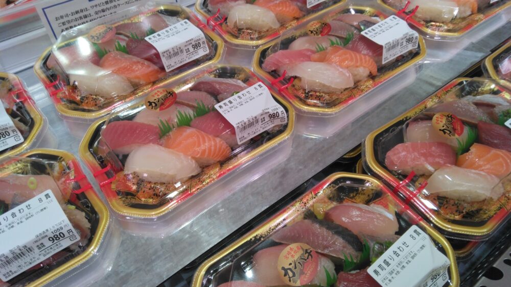 こんにちは!みしまや東川津鮮魚コーナーです!本日も当店のお寿司がおすすめ!週末にかけて広告品や地物のネタを使った品がたくさん!今日はちょっぴり豪勢にお寿司はいかがでしょうか?ぜひお買い求めくださいませ!