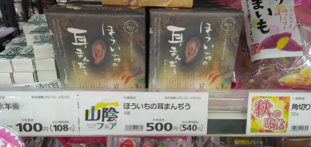 みしまや田和山店のお菓子コーナーおすすめ商品は、中浦食品のほういちの耳まんぢうです!へるん先生の怪談話でお馴染みの耳なしほういちの耳がなんと饅頭になって登場!見た目はドキッとするくらいリアルなお饅頭で、発売開始から大人気となっております! ぜひみしまや田和山でお買い求めくださいませ♪