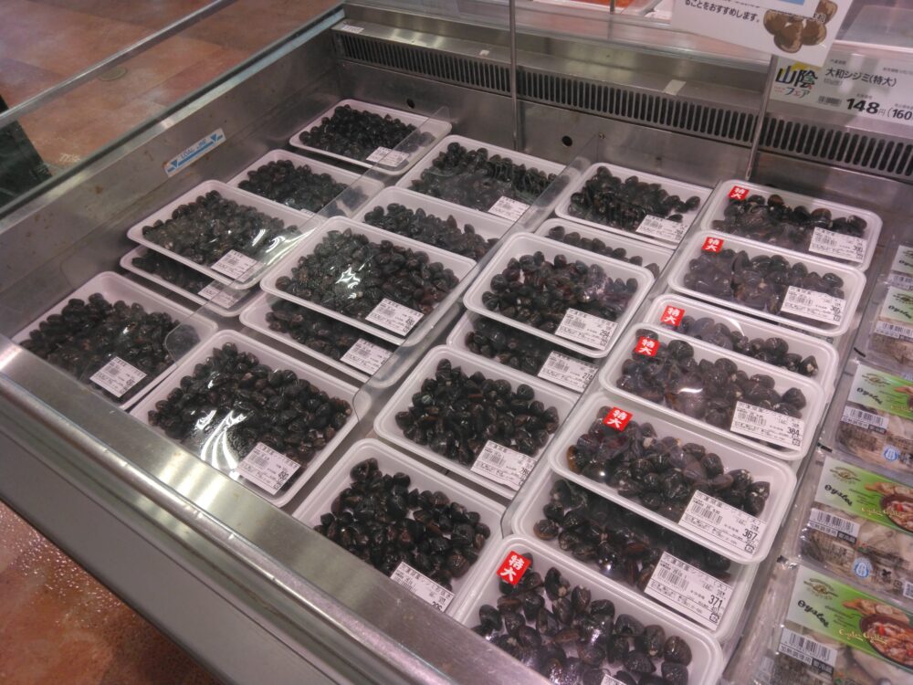 こんにちは楽山店です。今日は宍道湖産のシジミがおすすめです。特大サイズも品揃えしておりますので是非お買い求め下さいませ。