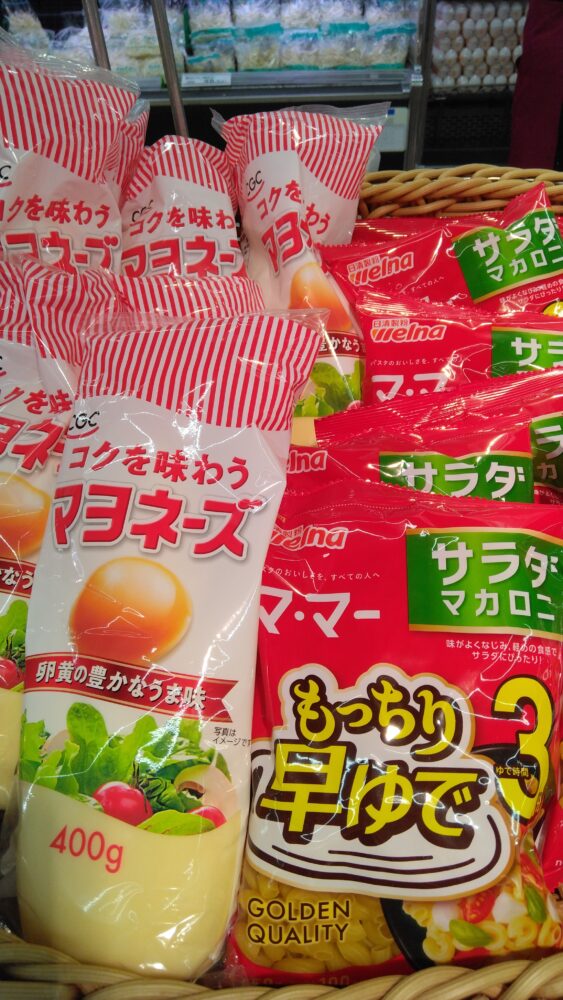 本日のおすすめはマカロニサラダです。マヨネーズとの相性もバツグン。3分で茹で上がるモチモチ食感のマカロニです。キュウリやハムと合わせてお召し上がり下さい。