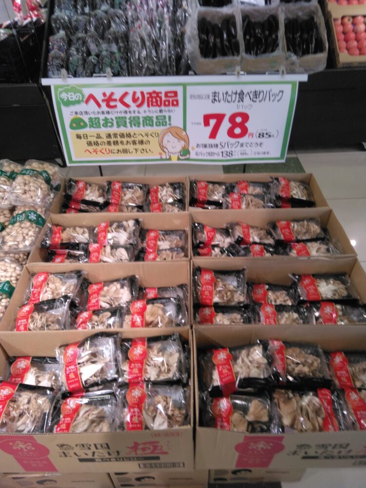 本日は舞茸食べきりパックがお買い得です。天ぷら、かき揚げ、味噌汁の具、炊き込みご飯などにどうぞ。