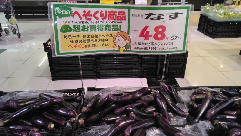 おはようございます!みしまや春日店青果コーナーです。本日のへそくりは熊本県産ナスです。お一家族様3本まで1本48円、4本目からは98円です。是非お買い求めくださいませ!