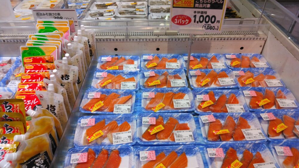 学園店水産コーナーです。 本日は、火曜祭開催しております。 大人気の3パック1000円(税込み価格1080円)の商品やお買い得商品が満載です。 是非お立ち寄り下さいませ。