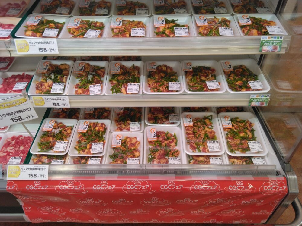 おはようございます!みしまや楽山店です。今月はCGCフェア開催中です。CGC商品を買って是非ともご応募くださいませ。精肉コーナーではCGC牛バラ焼肉用味付けを販売中です。今夜のおかずに、ご飯にのせて丼にとおすすめ商品となっております!冷凍ケースでは定額パックも販売しております。本日もみしまや楽山店へのご来店お待ちしております。